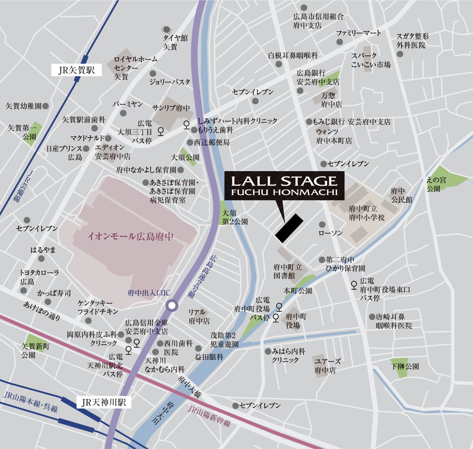 - 広電バス 府中町役場東口バス停徒歩7分(500m)広島駅・八丁堀経由 県庁行き